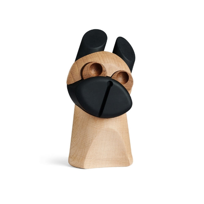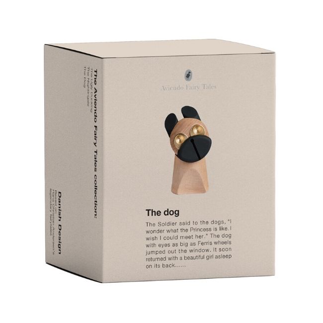 Sød hund fra den velkendte historie "Fyrtøyet" af H.C. Andersen - Det har store øjne som det runde år, og det kan ændre sit udtryk ved at dreje eller dreje hovedet. Hundens øjne er lavet her lavet af valnødtræ. Super fin som dekoration i børneværelset eller i hjemmet. Det kommer i en dejlig papkasse, så det er perfekt som f.eks. Dåbegave. Hunden er lavet af miljøvenligt gummi træ.