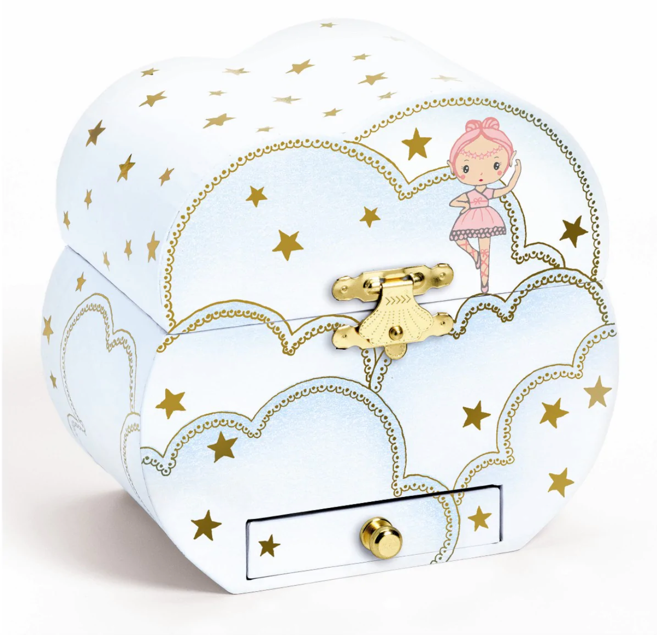 Denne dejlige lille smykkeskrin er fra Djeco. Smykkeskrinet har både musik spillet, når låget åbnes, og en figur, der drejer rundt i mellemtiden. Derudover har kabinettet et spejl, en kasse og et stort rum. Det er en god gaveide til et barn fra 4 år.