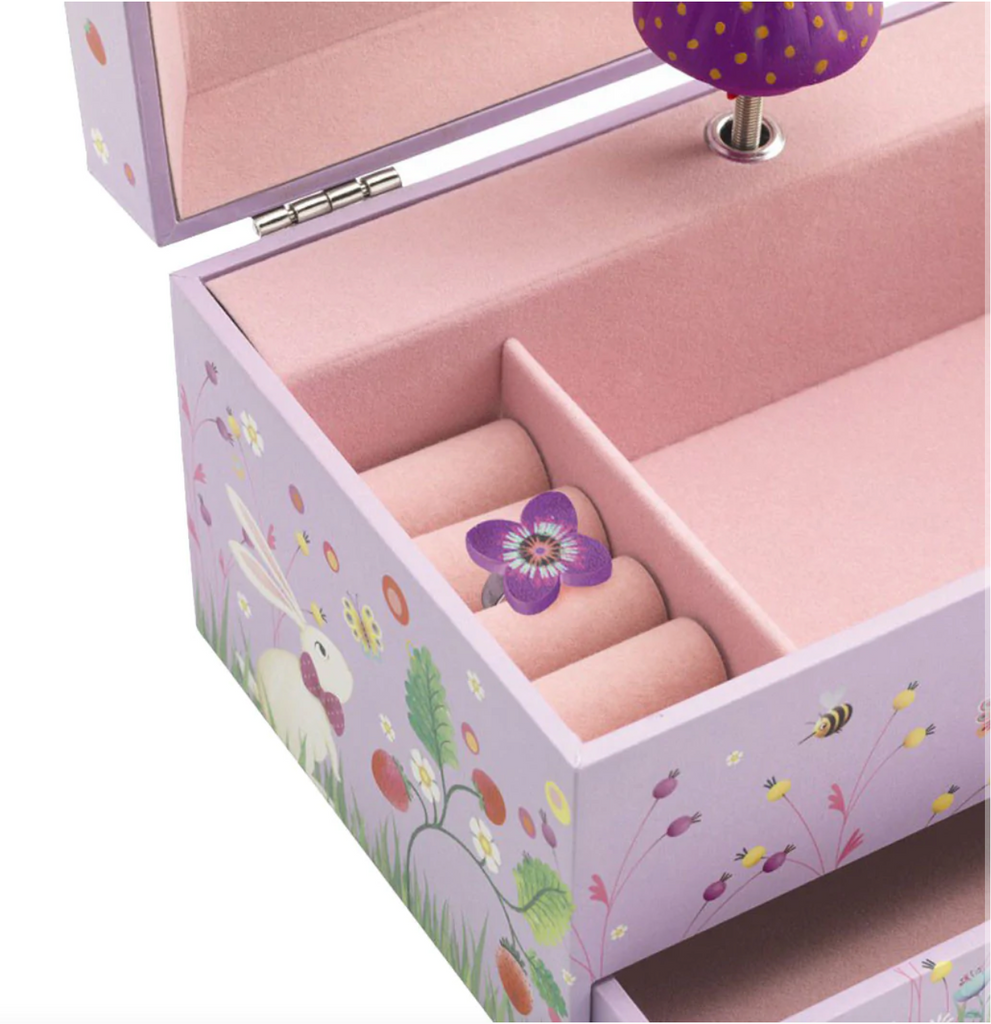 Smuk smykkeskrin fra Djepeco i en dejlig grøn farve. Smykkeskrinet har en sød bambus, der danser, når låget åbnes. Kontoret er opdelt i flere værelser og med en kasse til opbevaring af smykker. Det er en rigtig god gaveide til børn fra 4 år og fremefter.