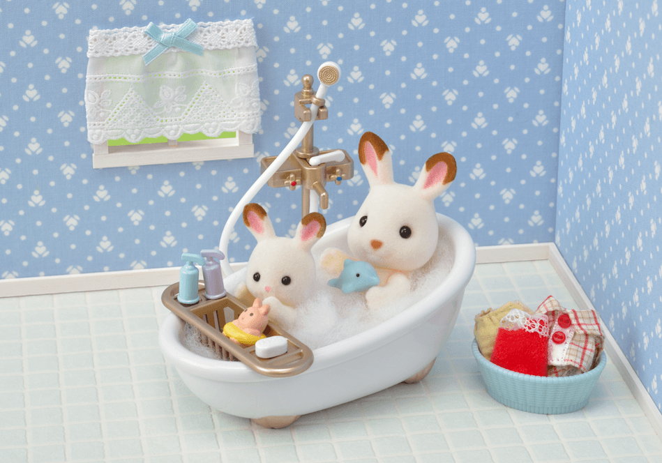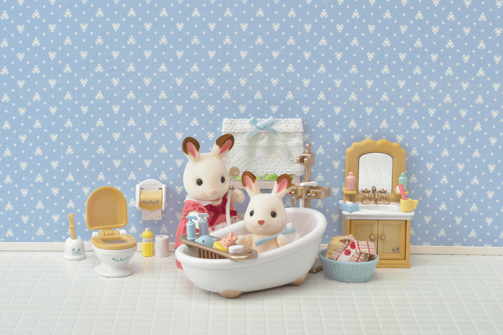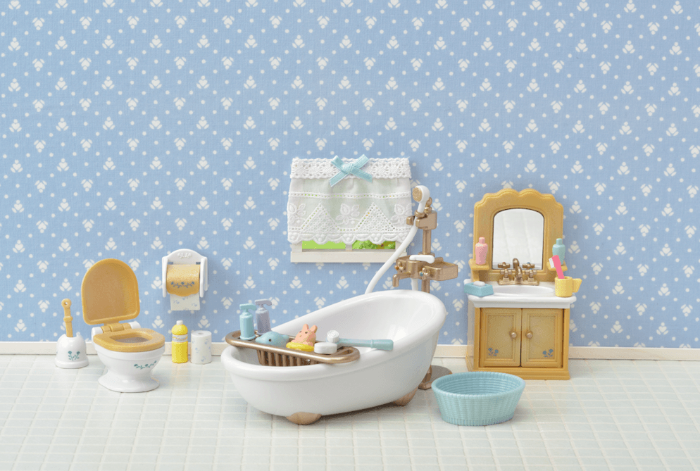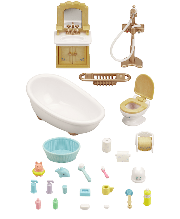Stilfuldt badeværelsessæt fra Sylvanianske familier. Sættet indeholder toilet, badekar, bruser og vaskebasin - så de små figurer vil ikke gå glip af noget.