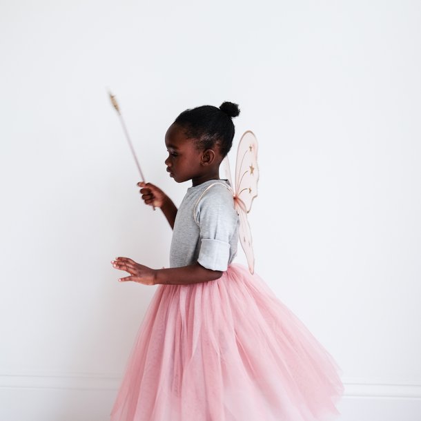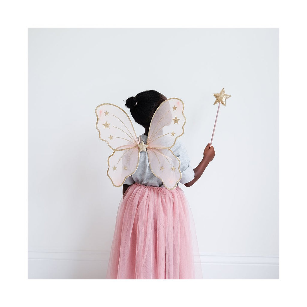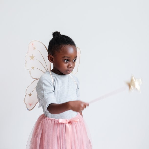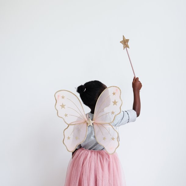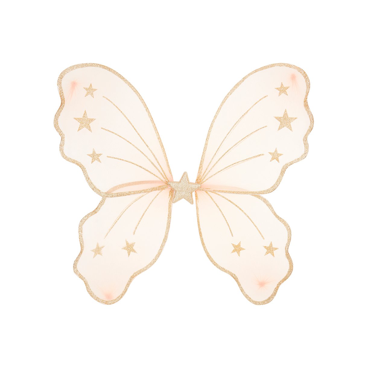 Disse smukke flodvinger er fulde af dejlige detaljer, der gør dem til de mest eventyrlystne vinger og et sikkert hit! Vingerne har dejlige guldsømme, små guldstjerner på vingerne og en større guldstjerne i midten. Derudover har vingerne elastiske stropper, der gør dem lette at tage af og med