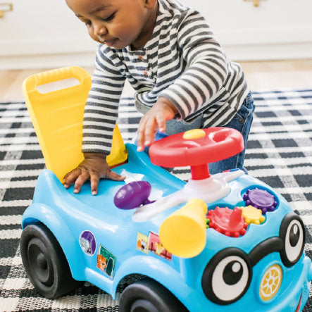 Bilen fungerer som et aktivitetslegetøj med sit instrumentbræt, der kan sige lyd og et gear, der ændrer farve.