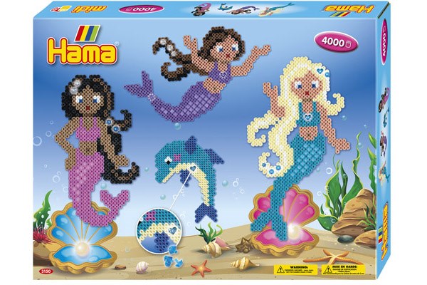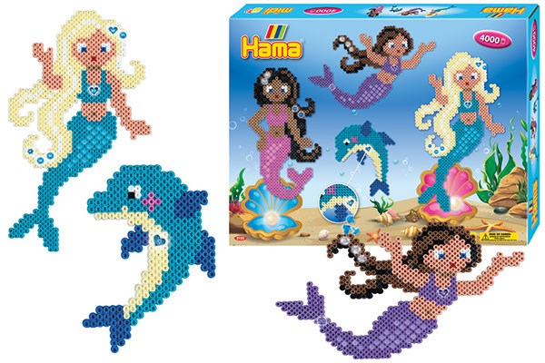 Fin gaveæske med perler og perle tønder med havfrue -motiver. Den lille kan træne fine motoriske færdigheder, mens de samtidig gør de søde havfruer selv. Gavefeltet indeholder omkring 4000 Midi -perler, 2 store firkantede perler, mønsterark i farver, instruktioner og strygepapir.