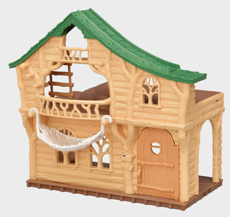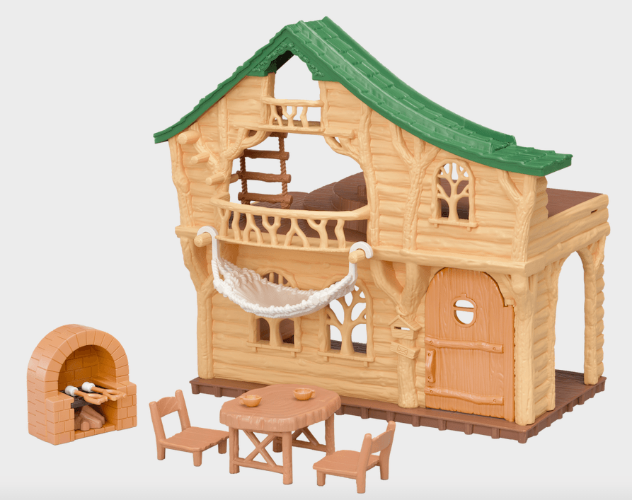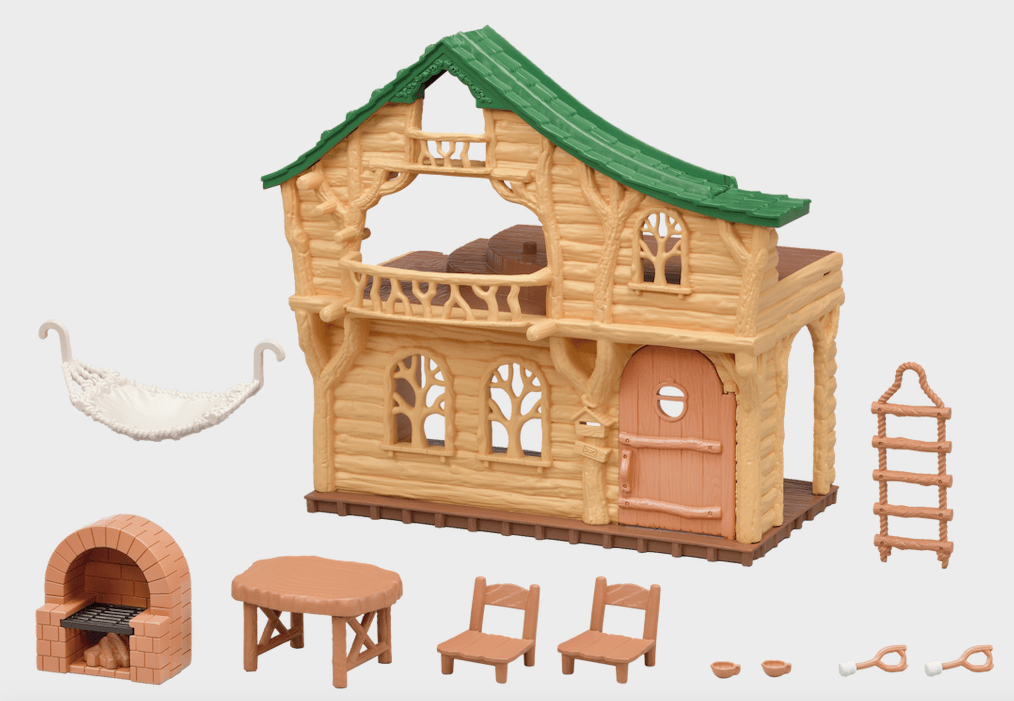 Huset ved søen er et dejligt hus på to etager, der har både hængekøje og stige. Derudover er der også borde og stole og en dejlig pejs.