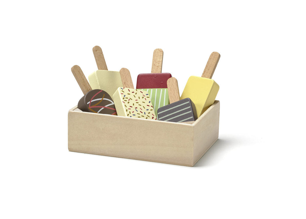Det fineste sæt af seks is og en holder for dem, der er malet i hvidt. Iserne har et super smukt design, der repræsenterer forskellige smag af is. Sættet er absolut perfekt til at lave sit eget lille isstativ. Derudover passer sættet perfekt med andre produkter fra Kid's Concepts Bistro Collection.