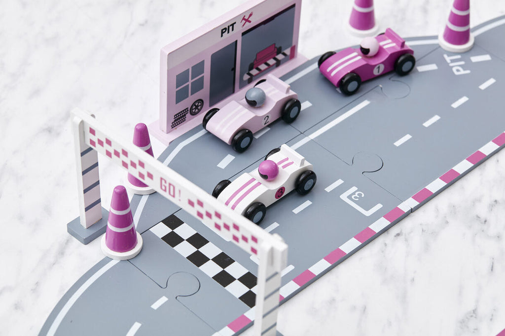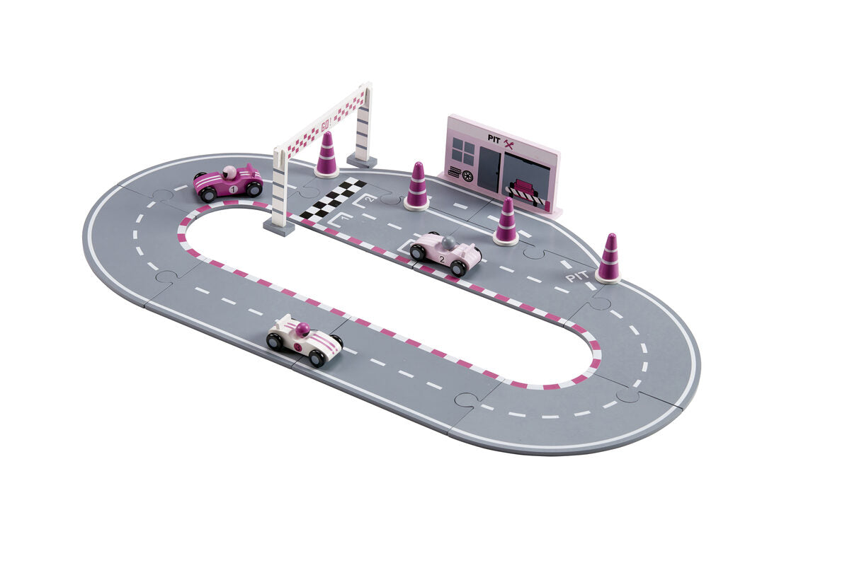 Super Fun Racing Car Set fra Kid's Concept i de klareste lyserøde farver. Sporet er et simpelt puslespil, der er let at tilføje. Foruden selve racerbanen indeholder sættet tre hurtige biler, fire kegler, en målbåndrolle og et depot.