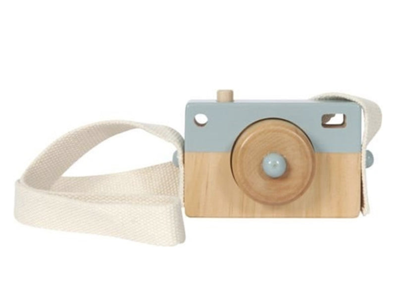 Det fine kamera er lavet af træ og her i naturlig farve og blå. Kameraet har en vævet rem, så den lille fotograf har kontrol over kameraet, når han tager billeder.