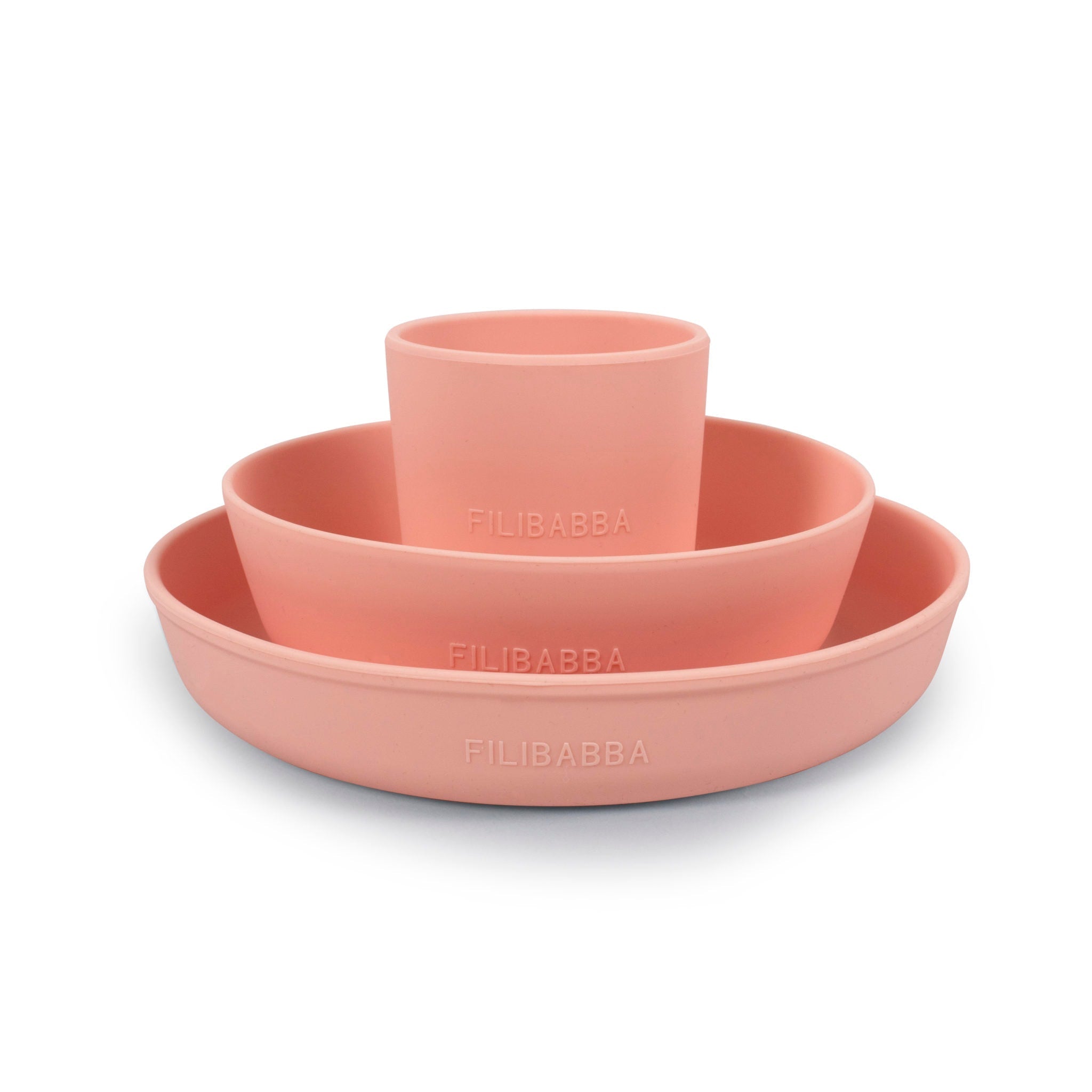 Philbabbas Matet i silikone i farvefersken er meget speciel, især i farve. Deres mad består af en kop, en skål og en plade. Sættet er lavet af 100% silikone med sugekopper under skål og plade.