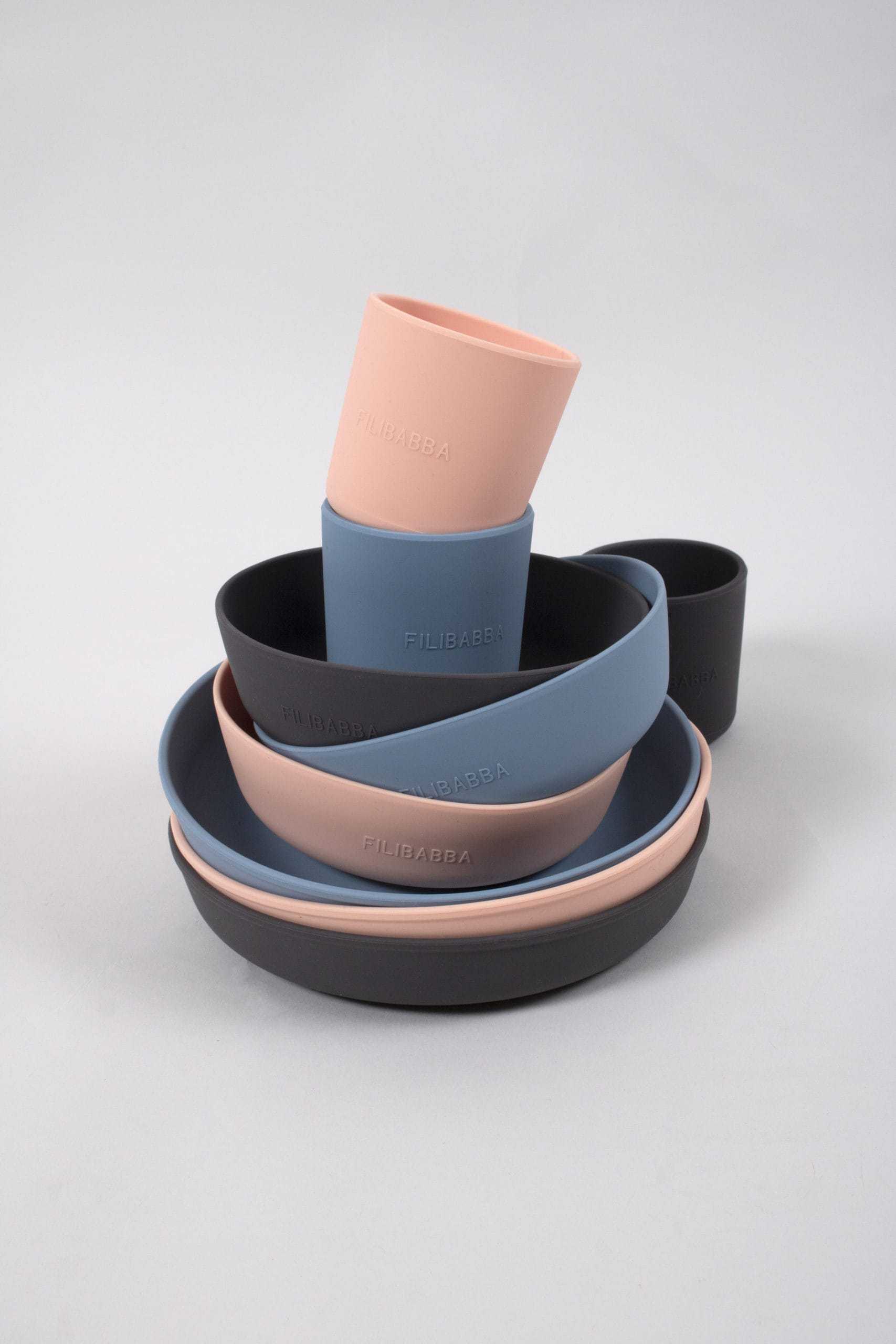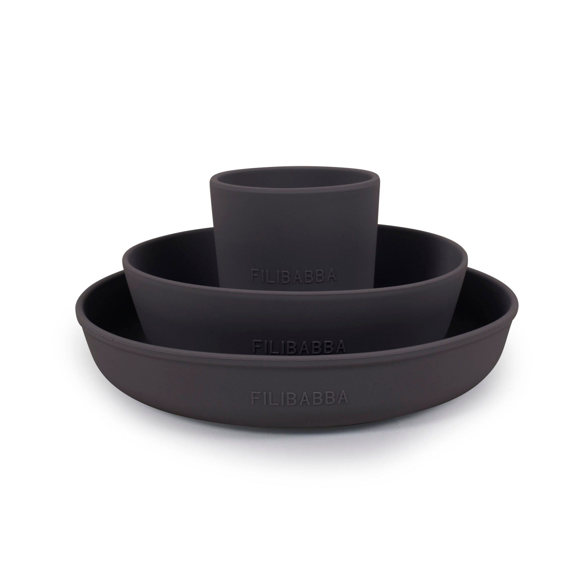 Philibabba's spisning i silikone i stengrå er både nyttigt og moderne. Sættet er lavet af 100% silikone, hvilket gør det blødt, når det røres. Den består af en kop, skål og en plade, som et plus er der sugekopper under skålen og pladen, der forhindrer den i at rulle rundt på bordet. Det kan også let pakkes sammen og bringe en tur, uanset hvor du skal hen.