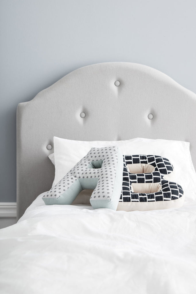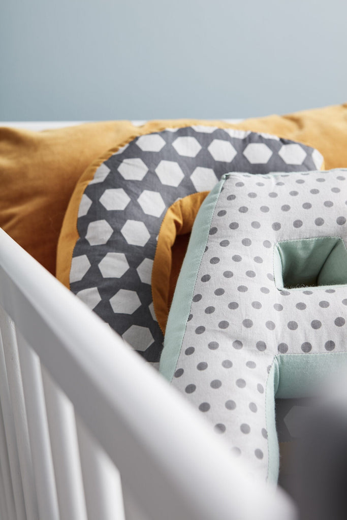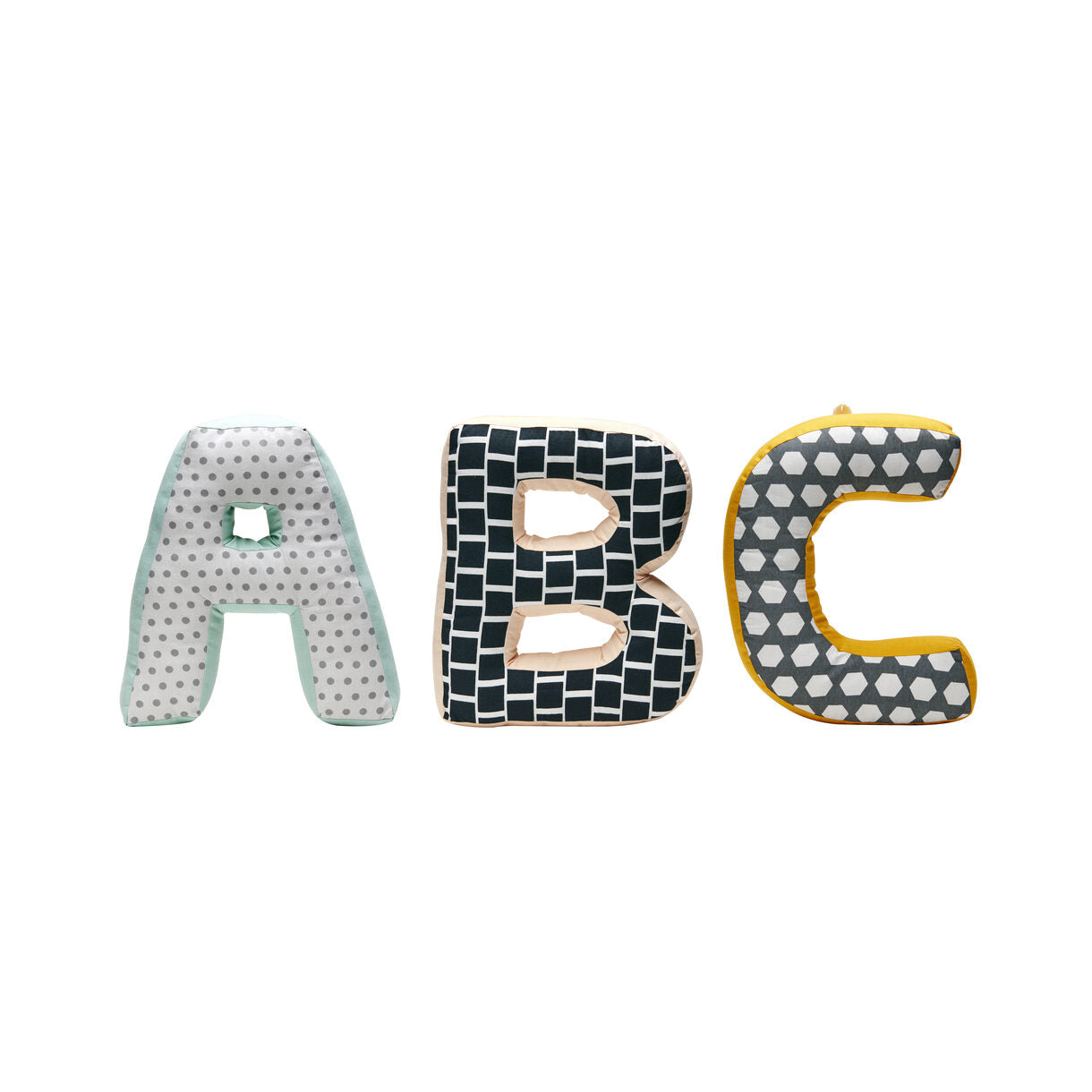 ABC -puder i fine farver med forskellige geometriske mønstre. De bløde puder fra børns koncept neo -samling passer perfekt ind i børneværelset.