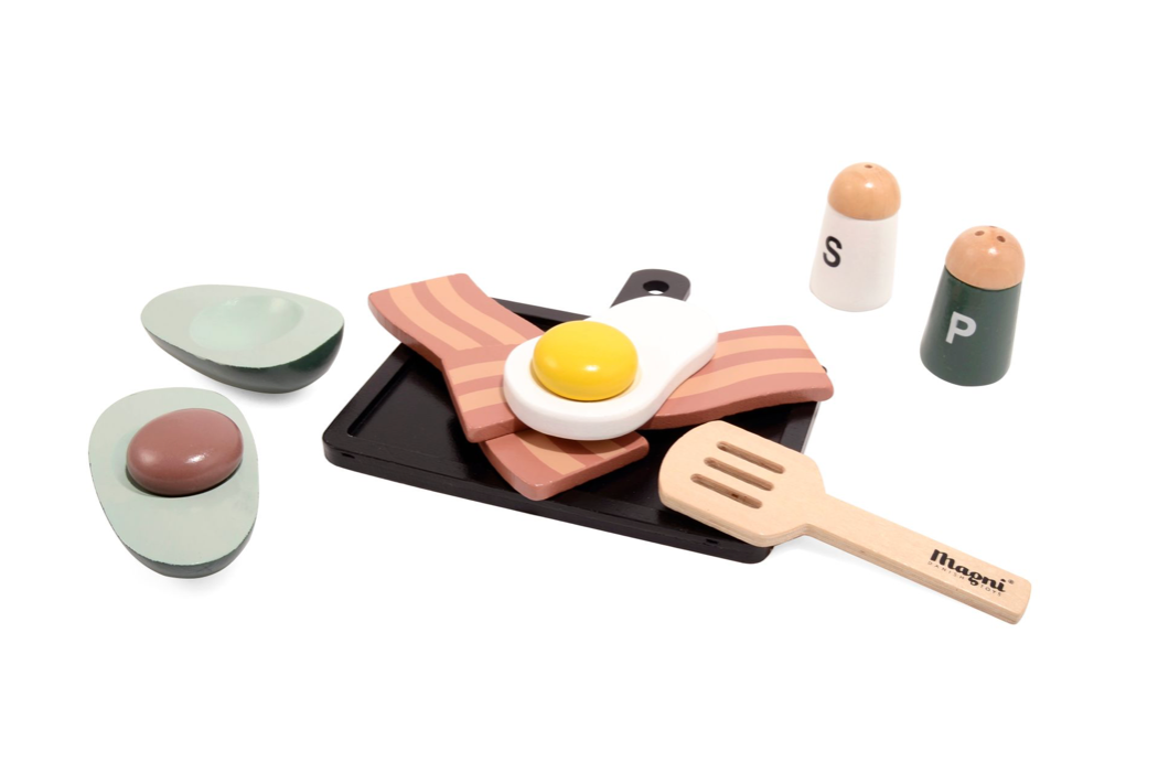 Fin bakke med æg og bacon, når morgenmaden serveres. Sættet indeholder 11 dele, der hjælper med at oprette den perfekte morgenmadsmenu.