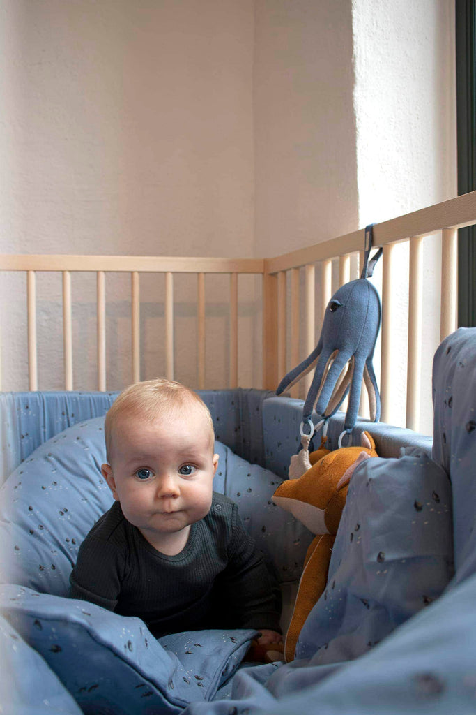meget Dette ubeskriveligt smukke blå farve. Sættet er super flot og superblødt, da det er lavet af organisk satin -vævet bomuld. Den lille baby finder mere rolig i dette strøelse.