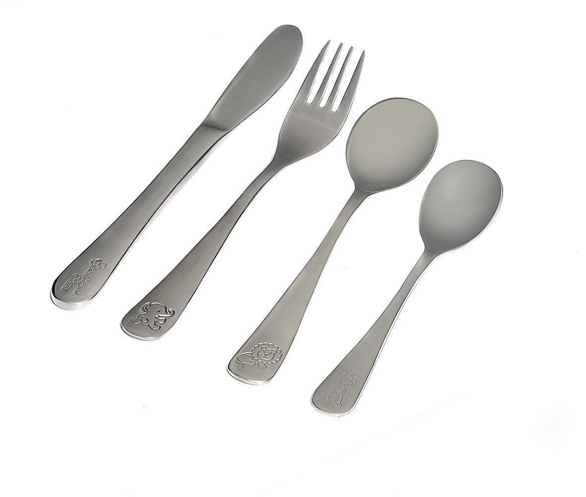 Fine børns bestik i rustfrit stål med søde dyremotiver. Perfekt som en sød gave til for eksempel dåbsbarnet.