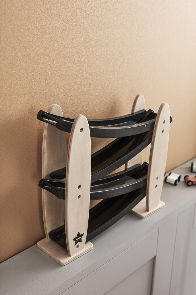 En super flot og enkel bilspor med tre små ledsagere, der kører helt ned, når du slipper dem på toppen. Bilsporet her er en del af Kid's Concepts Neo Collection.