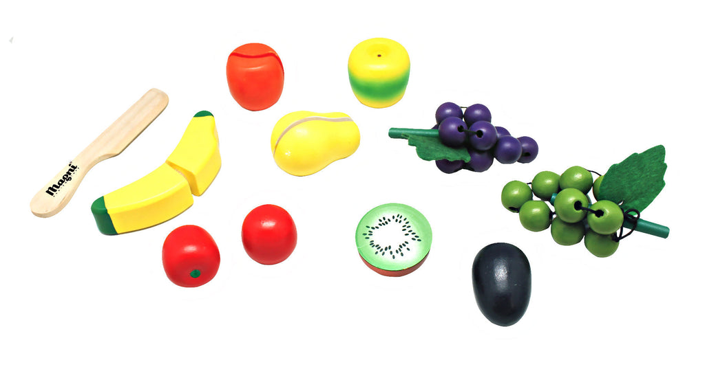 En netto fuld af frugter fra Magni. Frugt som pærer, druer, banan, æble og kiwi - så den lille kan virkelig blive skør i legekøkkenet. En legetøjskniv inkluderet, der kan skære frugterne i midten med velcro.