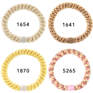 Smukke og farverige hårfjedre fra Kknekki. Hårene er skabt med en unik væveteknik, der gør den elastiske blide på håret og smertefrit at trække ud efter et sæt. Denne pakke leveres med 4 elastiske, og når de ikke sidder i håret, kan de bruges som stilfulde armbånd.