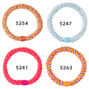 Stilfuldt og farverigt hårfjedre fra Kknekki. Hårene er skabt med en unik væveteknik, hvilket betyder, at elastikken er blid mod håret og smertefrit at trække ud efter sæt. Hårfjedrene fra Kknekki har et dejligt design, så de kan bruges som et armbånd, når de ikke er i håret.