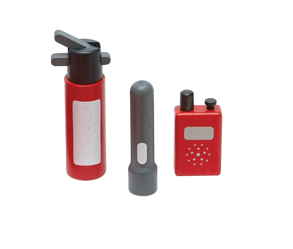 Indhold: Justerbar hjelm og jakke, megafon, ildslukker, vandslange, lommelygte, øks og en walkie talkie