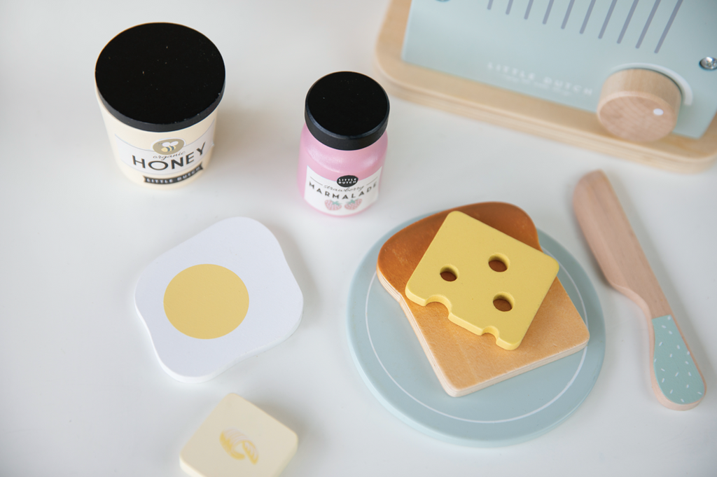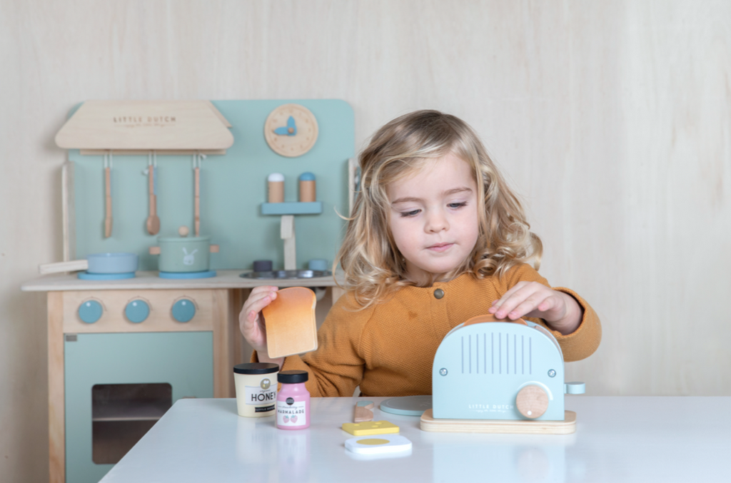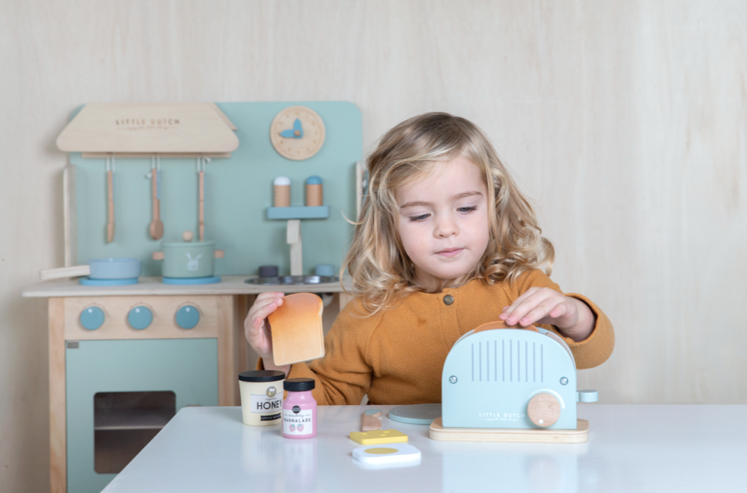 Superphine Wood Brother fra Little Dutch, der passer perfekt ind i dit barns legekøkken. Brødristeren har en smuk myntfarve og indeholder alt hvad du har brug for til en lækker morgenmad. Brødristeren her er ikke kun et sjovt legetøj, fordi men barnet opfatter det, det styrker deres evne til at lege og ikke mindst den fine motor.