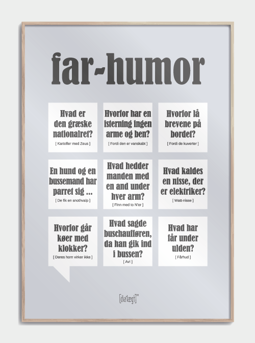 Denne far humor, S -plakat er ikke kun sjov og sprøjt, den har en rigtig dejlig og Stilfuldt design, så det kan let hænges foran hjemmet uden at tage for meget fokus. På plakaten er der 9 gode papkanser, der er i klar skrivning, og under vittigheden finder du det punkt eller svar skrevet i lidt mindre tekst. De smukke, store og skarpe bogstaver på denne plakat vil straks fange øjet. Plakaten er trykt på plakatpapir, og derfor kan du vælge, om det skal hænges som den er, eller om det skal være i rammen. Lang humor, du kan hænge plakaten, uanset hvor du tror, den passer, for selvom den fanger øjet, er det stadig neutralt i sit design og passer derfor ind i hele hjemmet.
