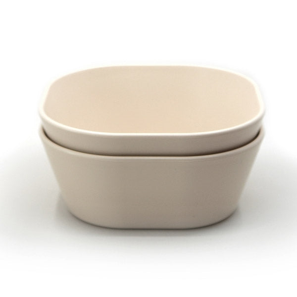 Fin pakke fra Mushie med to firkantede skåle. Skålene er i en dejlig knoglehvide farve og har en dejlig mat finish. De er lavet af en behagelig blød plast, så barnet let kan gribe det.