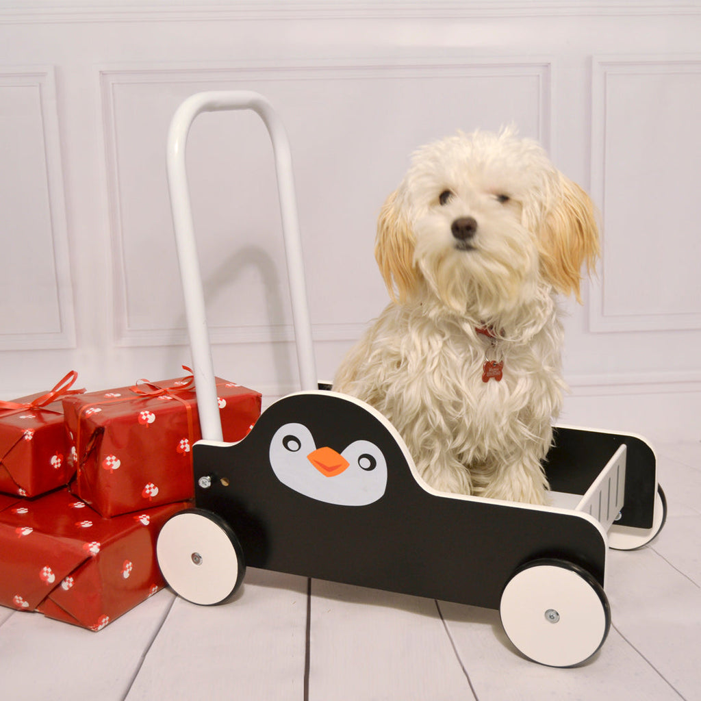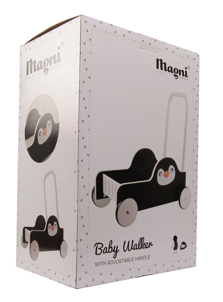 På siderne er der et dejligt motiv af en sød pingvin. På samme tid kan den lille bringe sit legetøj rundt ved at opbevare dem i den fine vogn.