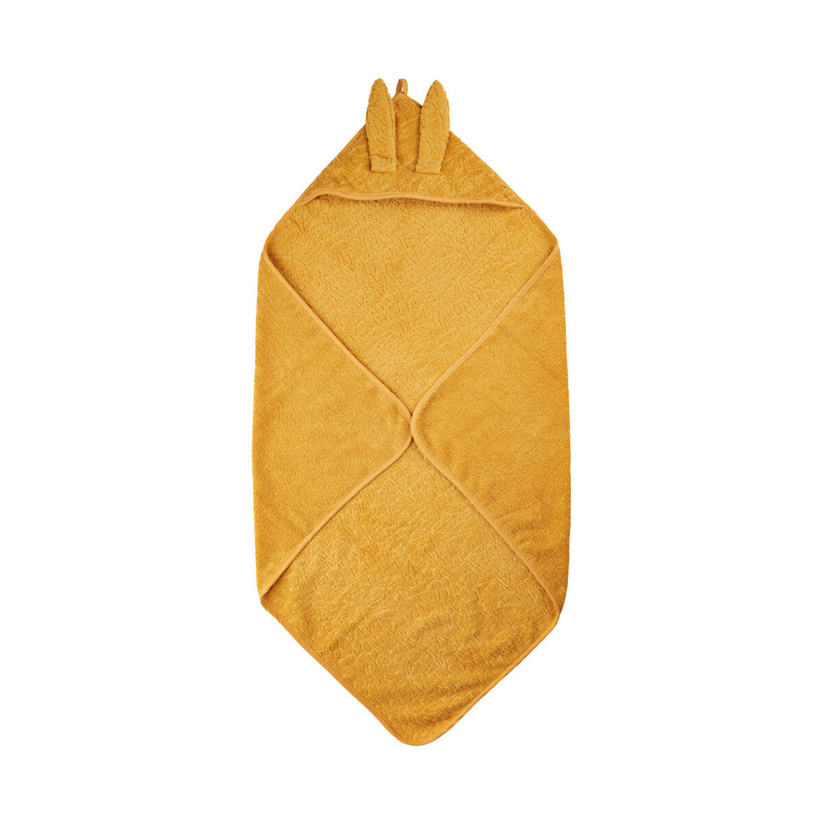 Et gult håndklæde lavet af 100% bomuld. Håndklædet har en super smart hætte i det ene hjørne og er derfor både godt og meget praktisk for dit barn.