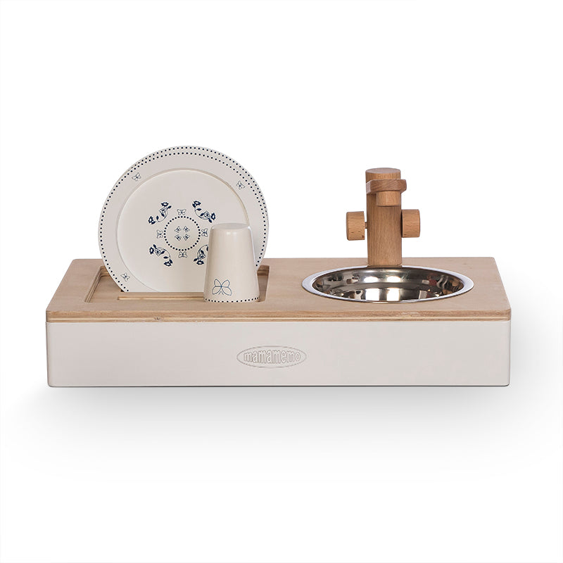 Fin vask i træ fra Mamamemo, så den lille kan vaske efter maden. Inviterer til en masse sjov leg i legekøkkenet i børneværelset.