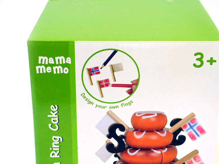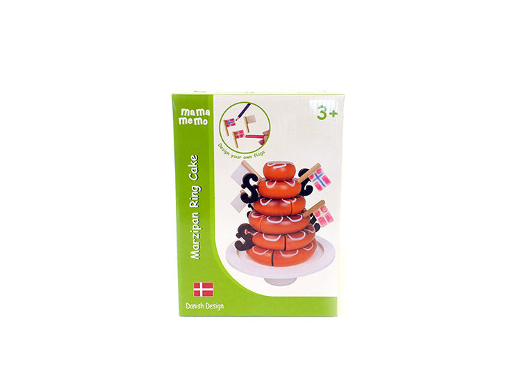 Dette fine trælegetøj fra Mamamemo er designet som en kranekage i flere lag med tønder, flag og dekorationer. Kranekagen kan opdeles i flere dele, så alle bamser og dukker kan få et tyggekage. Flagene til kagen er helt hvide, men kan trækkes til nøjagtigt de flag, du ønsker. Så lækker og indbydende som Mamamemo -kagen er, pryder den også legekøkkenet og børnenes værelse.