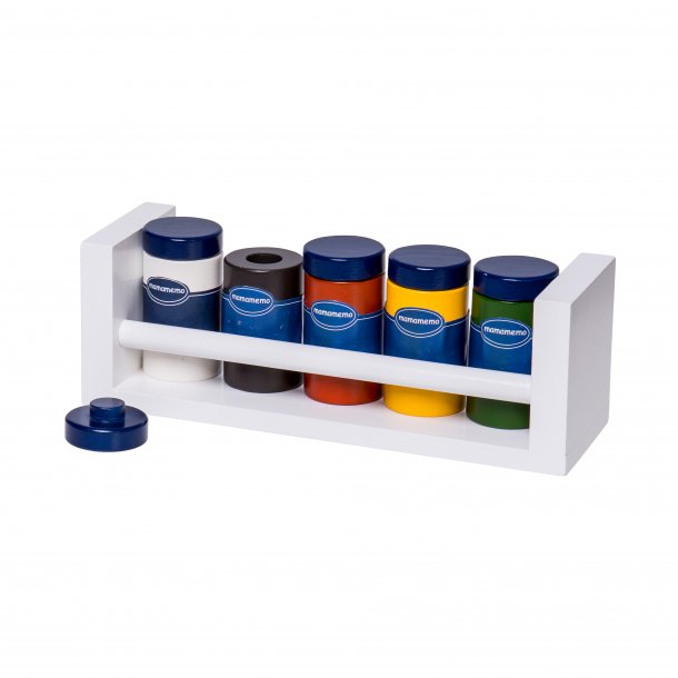 Spice Rack in Wood fra Mamamemo, der passer perfekt i Play Kitchen fra Mamamemo. 5 forskellige krydderi -dåser med låg inkluderet.
