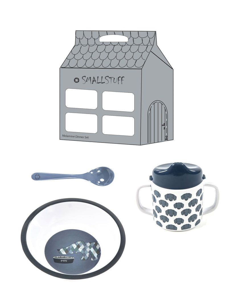 sød Matet i melamin med katte fra Smallstuff, der indeholder en skål, kop med bip og en skefuld.