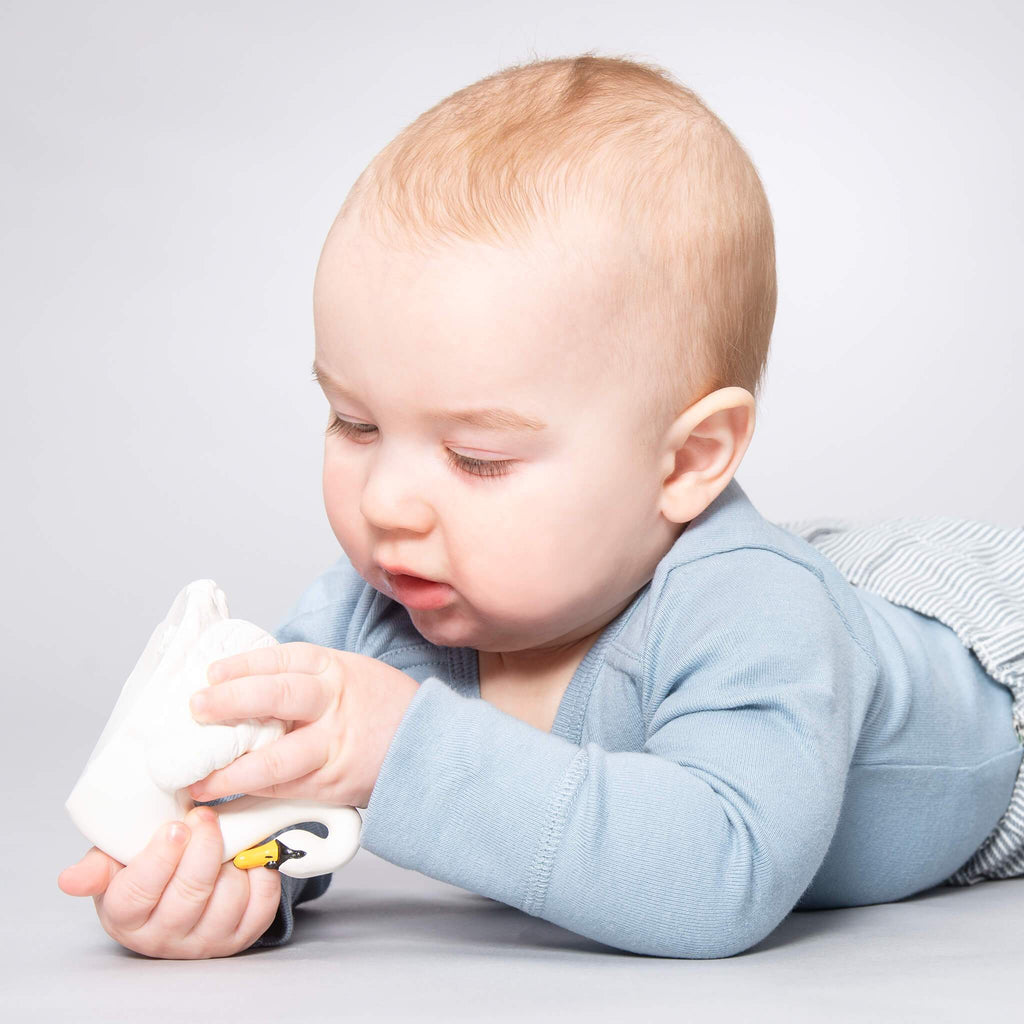 Badelegetøjet fungerer også som et bid -legetøj og giver lettelse i ømme tandkød. Det er perfekt til små hænder at holde i.