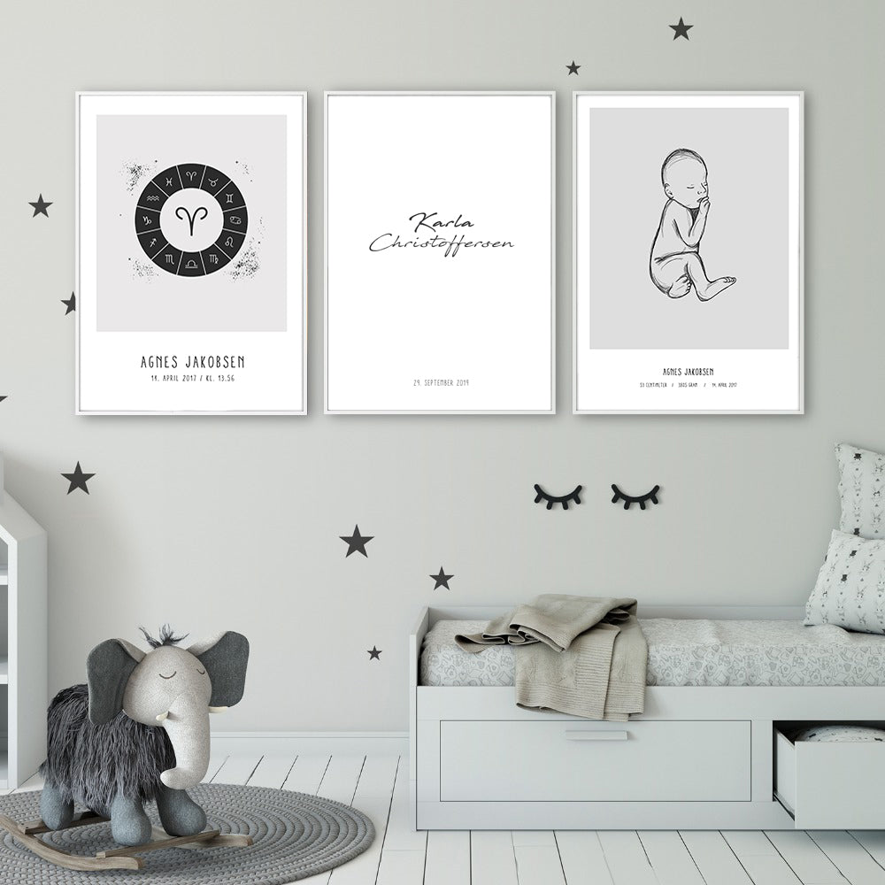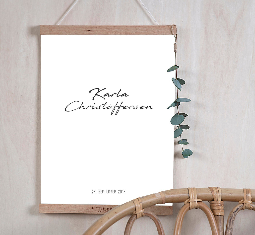 Vi anbefaler, at disse varer placeres i en plakatophæng og dermed afslutter det færdige design. Du kan også finde plakatophæng her i butikken fra Little Dutch til dit navnplakat. Du kan også kombinere disse plakater med flere personlige fødselsplakater eller fødselstavler.