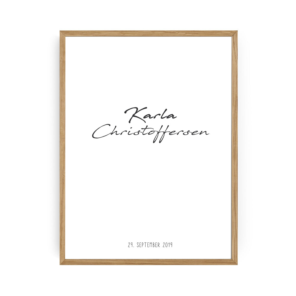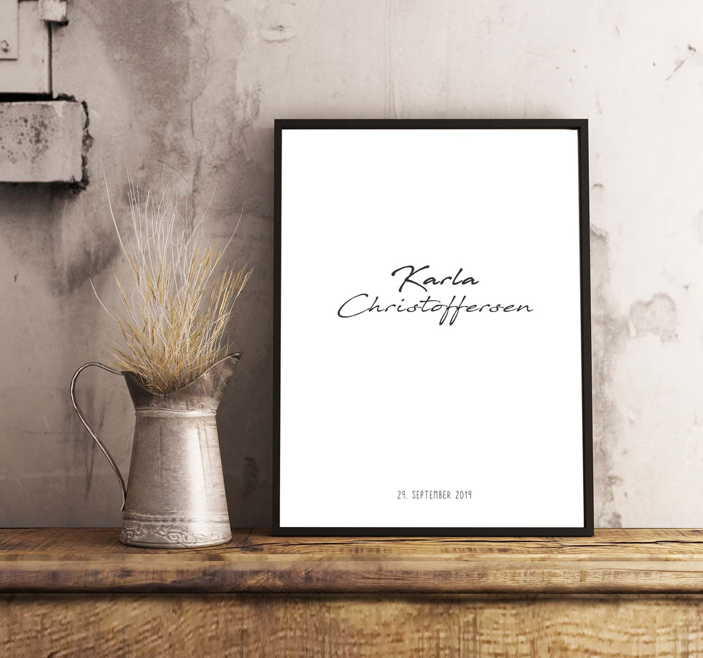 M -Designet navnplakat eller fødselsplakat fokuserer på smukt skandinavisk design fuld af personlighed. Du får en plakat med dit barns fulde navn, fødselsdag og år. Det vil ikke være mere personlig.