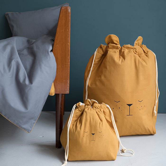 SuperSmart -opbevaringspose fra Fabab lavet af organisk bomuld og formet som en sød bjørn. Opbevaringsposen kan lukkes med en smart løbebånd. Inde er det foret med quiltet foder og er også polstret for at holde formen bedre.