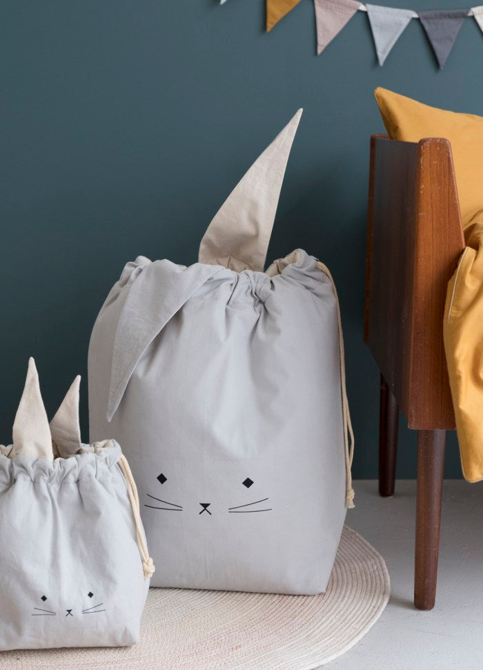 SuperSmart -opbevaringspose fra Fabab lavet af organisk bomuld og formet som en sød kanin. Opbevaringsposen kan lukkes med en smart løbebånd. Inde er det foret med quiltet foder og er også polstret for at holde formen bedre.