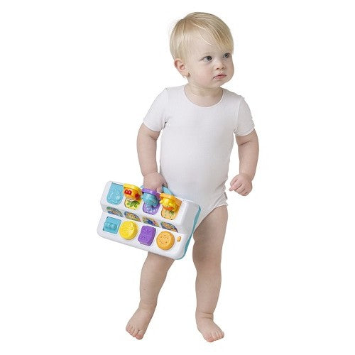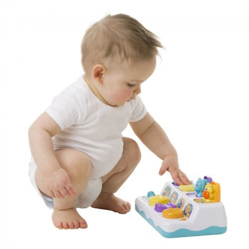 Sjovt pop-up legetøj fra playgro, med jungeldyr. Tryk, drej eller tryk på knapperne, og de små dyr vises.