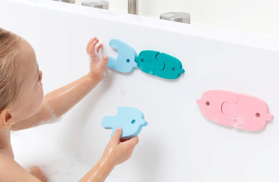 puslespil fra quut til badet bestående af hvaler i forskellige størrelser og farver. Alle kan flyde eller blive bygget op langs kanten af badekaret eller på pladerne. Blokkene "sidder fast", når de er våde, så de kan placeres på siden af badekaret , fri for BPA, latex og phthalater