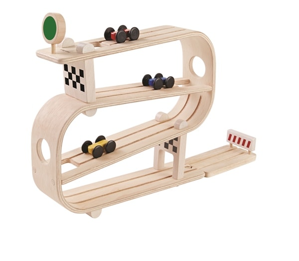 Slip bilerne ovenpå og se dem skynde sig væk på denne racerspor fra plantoys!