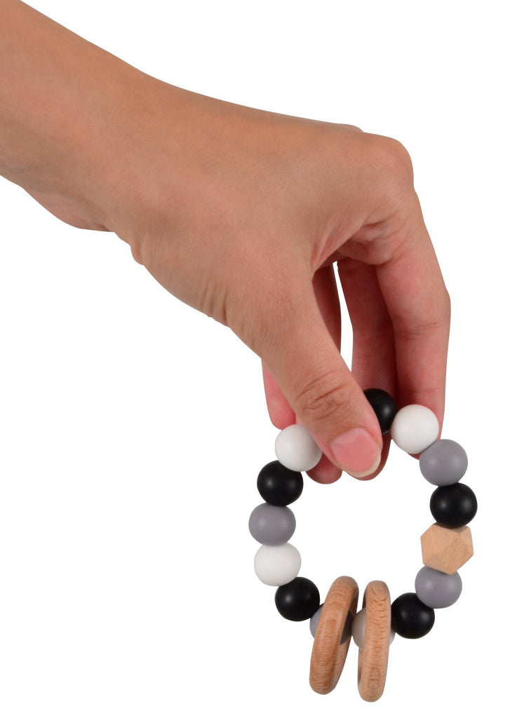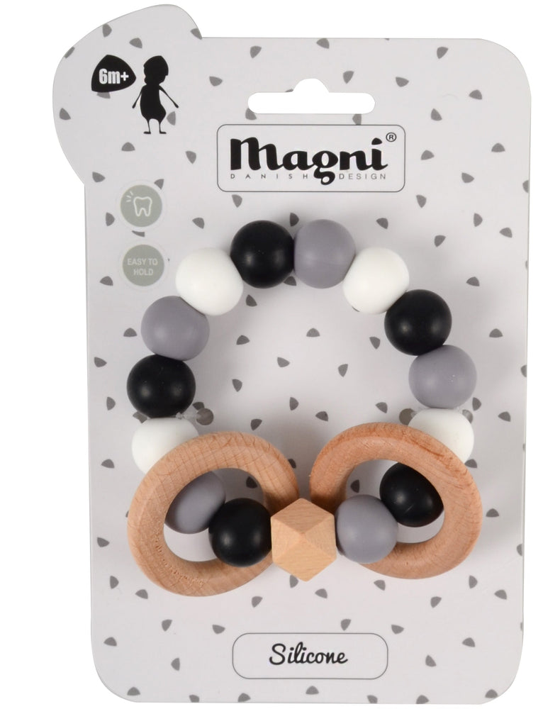 Smukke rangler fra Magni, der har silikoneperler, der er godkendt af mad, så det er ganske sikkert for den lille at lægge i munden. En god ting at have bagpå, når den lille er træt af ømme tandkød.