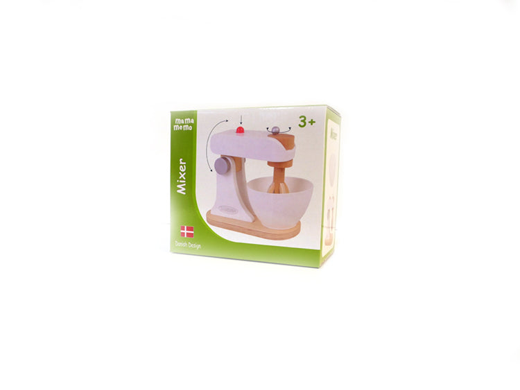 Før du kan lave en kage i børneværelset, skal du blande en dej. Dette fine trælegetøj fra Mamamemo gør det perfekt. Mixeren kan vippes op og ned, så den tilhørende skål kan tages ind og ud. Pisken kan drejes med den runde kugle oven på maskinen.