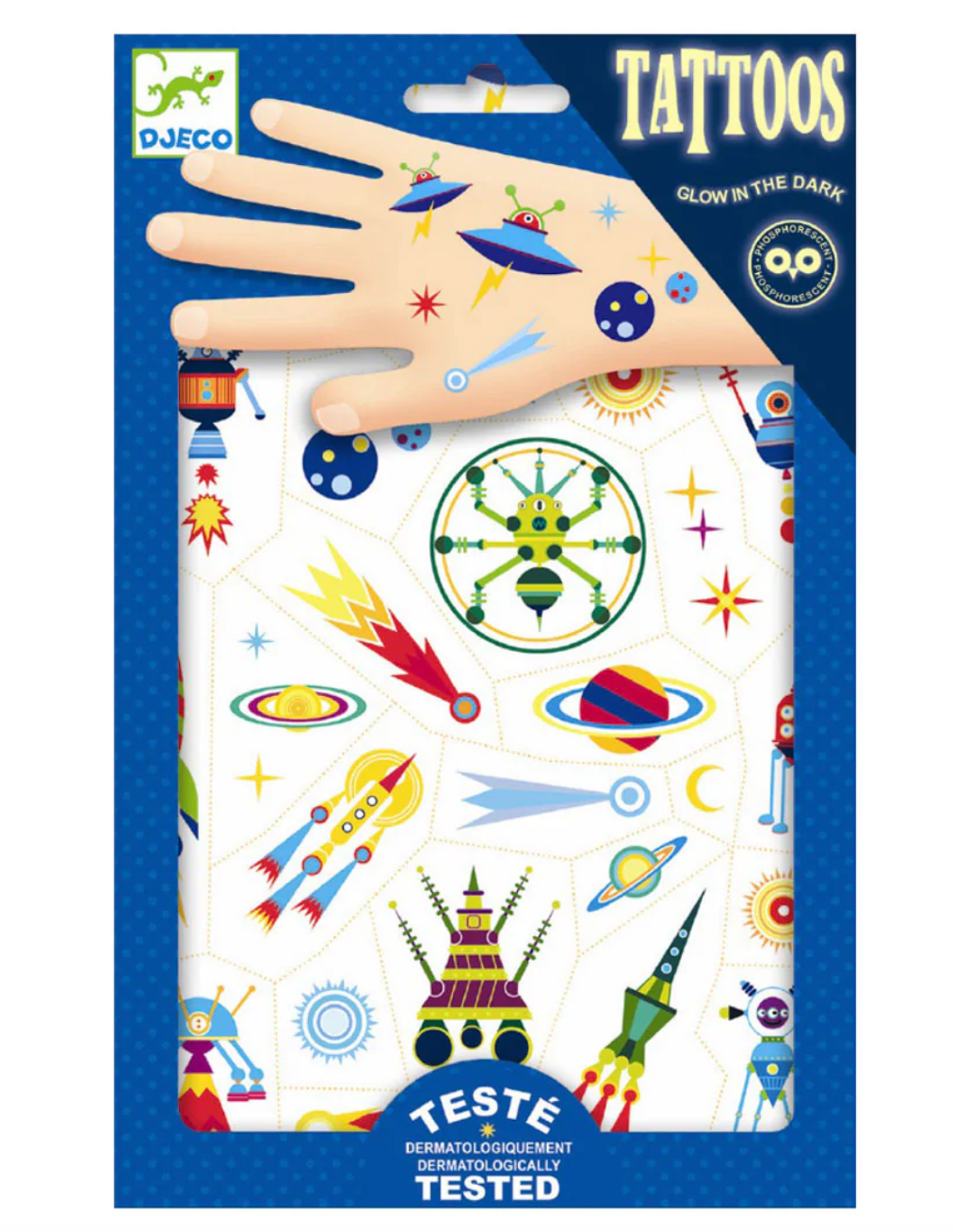 Denne fine pakke med lysende tatoveringer er fra Djeco. Pakken indeholder 2 ark fyldt med kølige tatoveringer med motiver fra rummet. De er lette at bruge; Du skal blot skære det ønskede motiv ud, fjerne filmen, anvende tatoveringen på huden og derefter let den med vand.