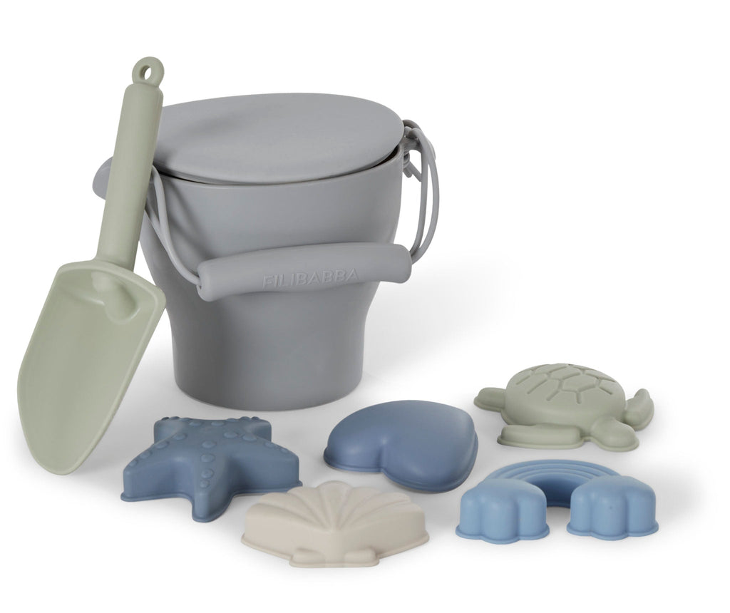 Stilfuld strandsæt fra Filibabba i silikone. Sættet består af fem forskellige forme, skovle, spande og en smart cover, som også kan bruges som frisbee.