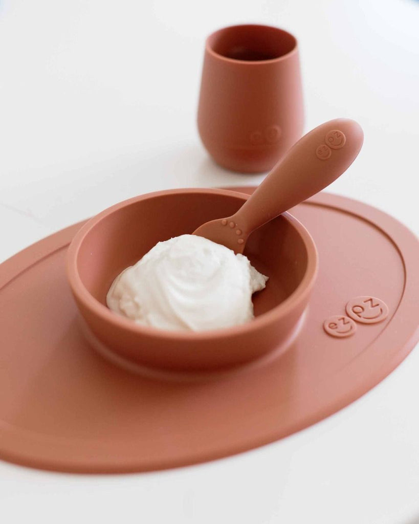 Perfekte spisesteder til børn fra EZPZ. Sættet er designet til at passe til barnets lille mund og hænder. Den bløde silikone beskytter barnets tænder, både før og efter udbrud. Silikonen er også selvlysende på en ren overflade (f.eks. Ikke træ), så skålen/underlaget ikke ruller over.