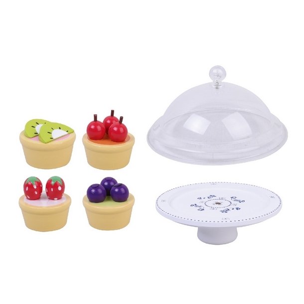 Sødt trælegetøj fra Mamamemo. 4 små tærter, 1 kage tønde i kongelig design og et gennemsigtigt låg er inkluderet - så den lille kan virkelig gå i krig i Big Back -konkurrencen i Play Kitchen og handle om wienerbrød