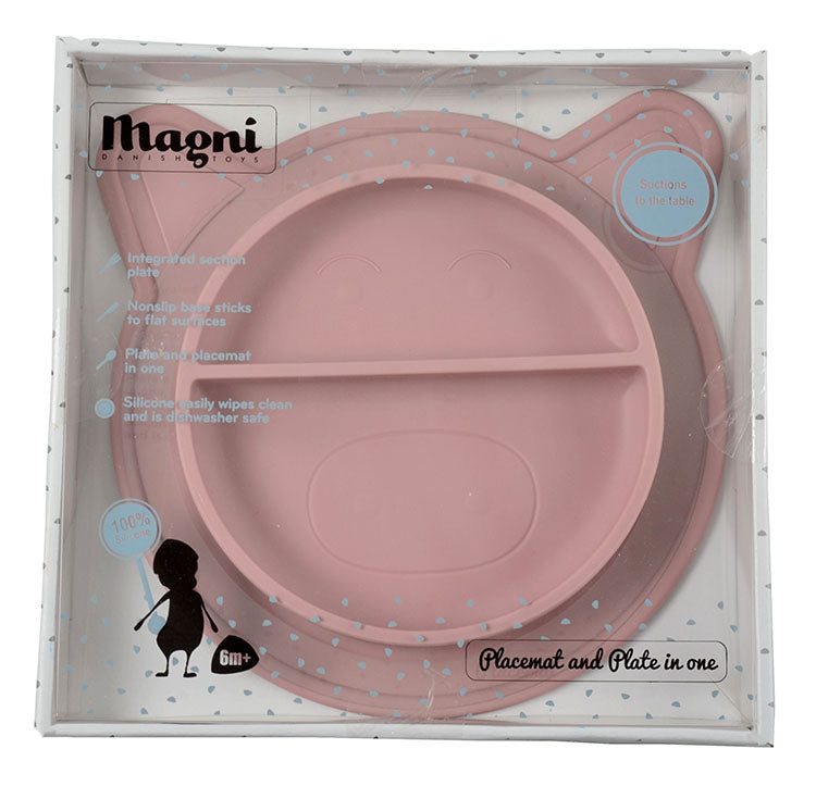 Stilfuld slip -fri plade, formet som en gris, fra Magni -mærket. Pladen er opdelt i 2 sektioner og lavet af 100% silikone. Pladen stopper, hvor den er indstillet, og glider ikke rundt på bordet. Med denne plade forhindrer du, at de små skubber pladen væk fra bordet og spilder maden overalt. Let at rengøre og kan modstå maskindisk.