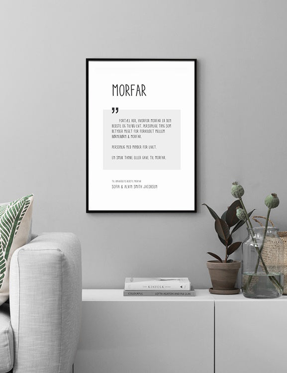 Plakaten er personlig, hvis du kan skrive en tekst fra den lille til den glade i den grå "ramme". Vi indsætter teksten og skriver afsenderen i bunden af plakaten. Udfyld bare felterne, når du bestiller, og vi tager os af resten og sørger for, at du har den bedste gave til de små, der er interesseret i.