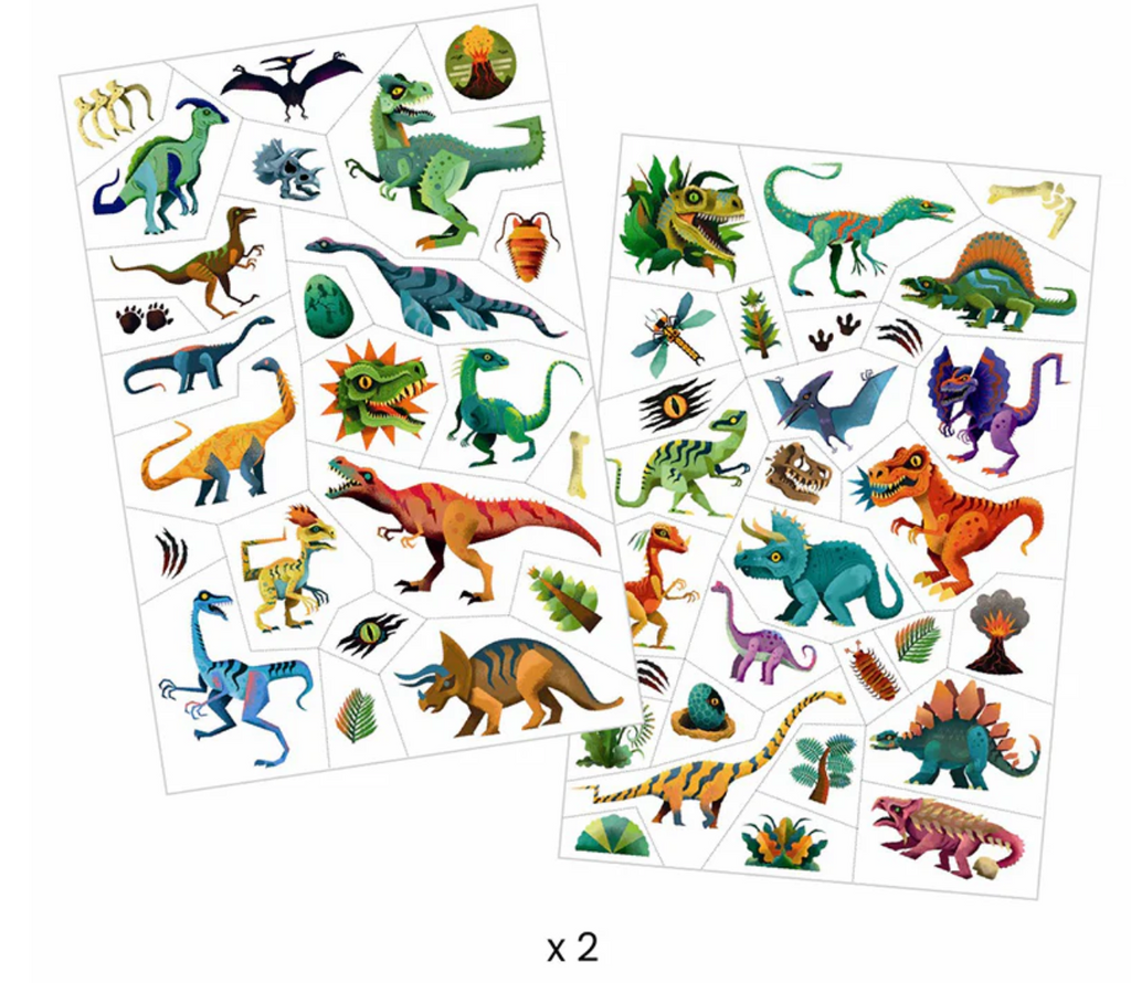 Denne seje pakke med tatoveringer er fra Djeco. Pakken indeholder tatoveringer med forskellige dinos på 2 ark. De er lette at bruge; Skær bare det ønskede motiv ud, fjern filmen, påfør tatoveringen på huden og derefter let den med vand.