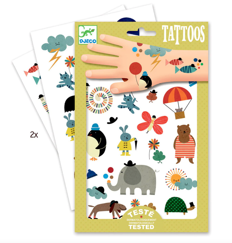 Denne fine pakke med tatoveringer er fra Djeco. Pakken indeholder sjove tatoveringer med mange forskellige dyr. De er lette at bruge; Skær bare det ønskede motiv ud, fjern filmen, påfør tatoveringen på huden og derefter let den med vand.