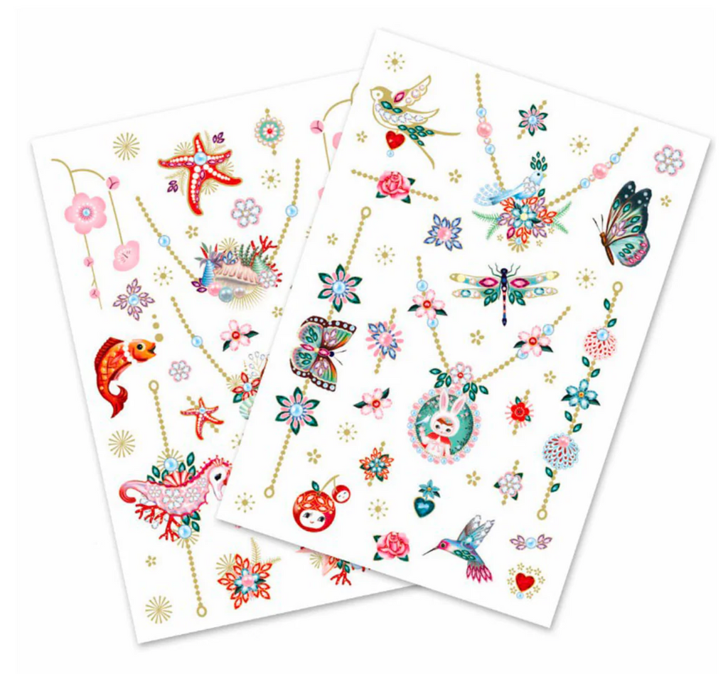 Denne dejlige pakke med tatoveringer er fra Djeco og med dejlige motiver. Pakken indeholder 2 ark fyldt med smukke tatoveringer med motiver af fine smykker og dyr. De er lette at bruge; Skær bare det ønskede motiv ud, fjern filmen, påfør tatoveringen på huden og derefter let den med vand.